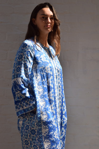 The gently structured silhouette drapes effortlessly to a flattering maxi length, creating a floaty, feminine line. A soft round neckline leads into a full button-through placket, while fluted cuffs add subtle romance and movement. Designed to slip on with ease, this dress offers a loose, relaxed fit—size down if you're between sizes.