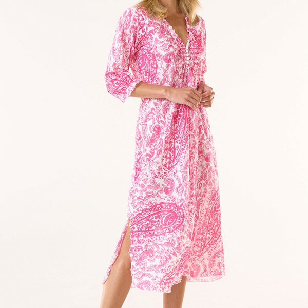 Elevate your beachside style with the One Season India Dress in Paisley Print, a perfect blend of elegance and ease for summer outings. This floaty, loose-fit maxi dress is crafted from 100% viscose, offering a lightweight and breathable silhouette that moves effortlessly with you. Featuring a charming round neckline and a button-through placket, the dress is accented with fluted cuffs for a touch of sophistication. The vintage-inspired paisley print, created using traditional Indian stamp techniques, adds a timeless floral charm to this chic beach dress. Designed for stylish beach walks, this Australian-designed piece pairs beautifully with strappy sandals for an effortless, relaxed look.