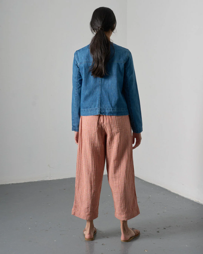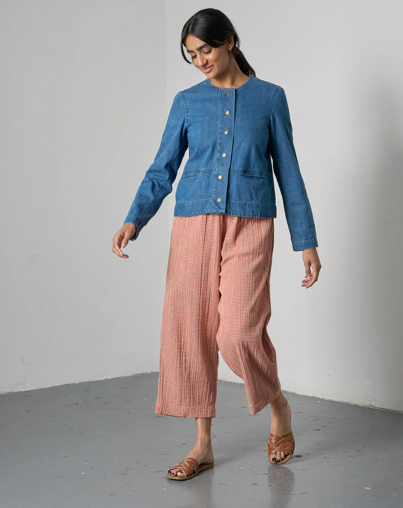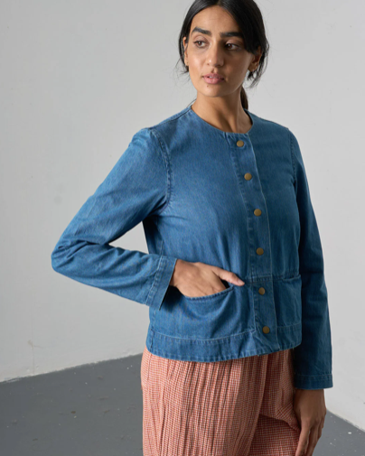 Collarless blue denim jacket in soft, midweight cotton. Cropped shape with snap brass buttons, twin-needle detailing, and in-seam pockets at the front, with a back yoke panel and centre back seam. A versatile denim jacket to layer with.