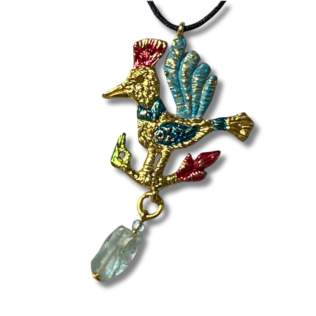 Joyful and full of folk-art character, this colourful bird pendant by Anna Dodenhoff is inspired by traditional Greek embroidery patterns seen in folklore museums. The bird's uplifted wings, vivid crest, and bold foliage perch are hand-painted in enamelled brass, and the pendant is finished with a translucent glass drop bead that catches the light with every move.