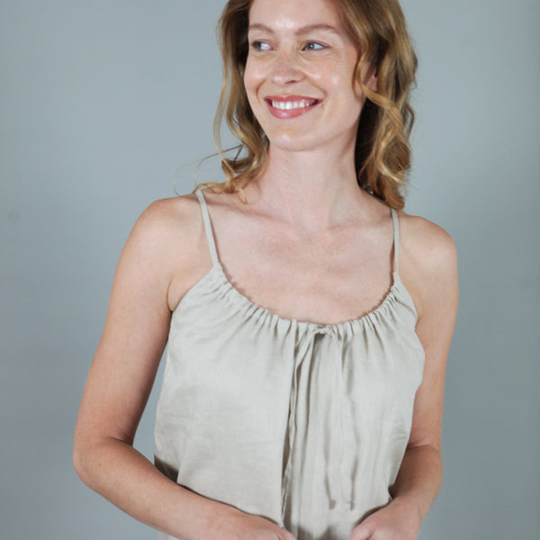 Meet Bonnie, the epitome of effortless style. Our fun, stylish 100% linen jumpsuit is a happy addition to any wardrobe. Featuring a front-tying drawstring neckline, it exudes both chic flair and comfort. Bonnie’s charm lies in her versatility, on cooler days we like to layer Bonnie over a plain white tee.