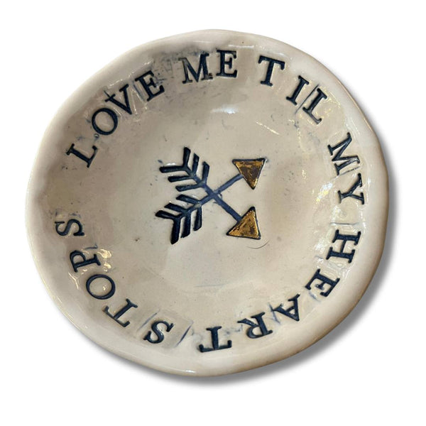 Bold, poetic, and beautifully handmade – this 13.5cm ceramic plate by local artist Jane Tyler makes a powerful declaration of love. Featuring the phrase “Love me ‘til my heart stops” in dark blue lettering and a pair of hand-painted golden arrowheads at its centre, this tactile piece makes a statement whether used functionally or decoratively.