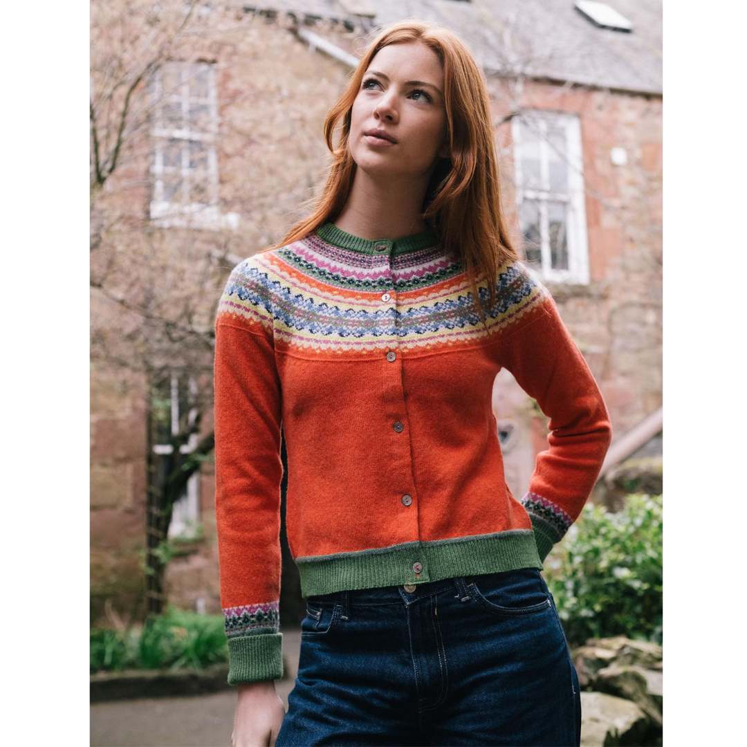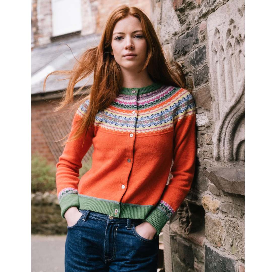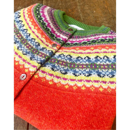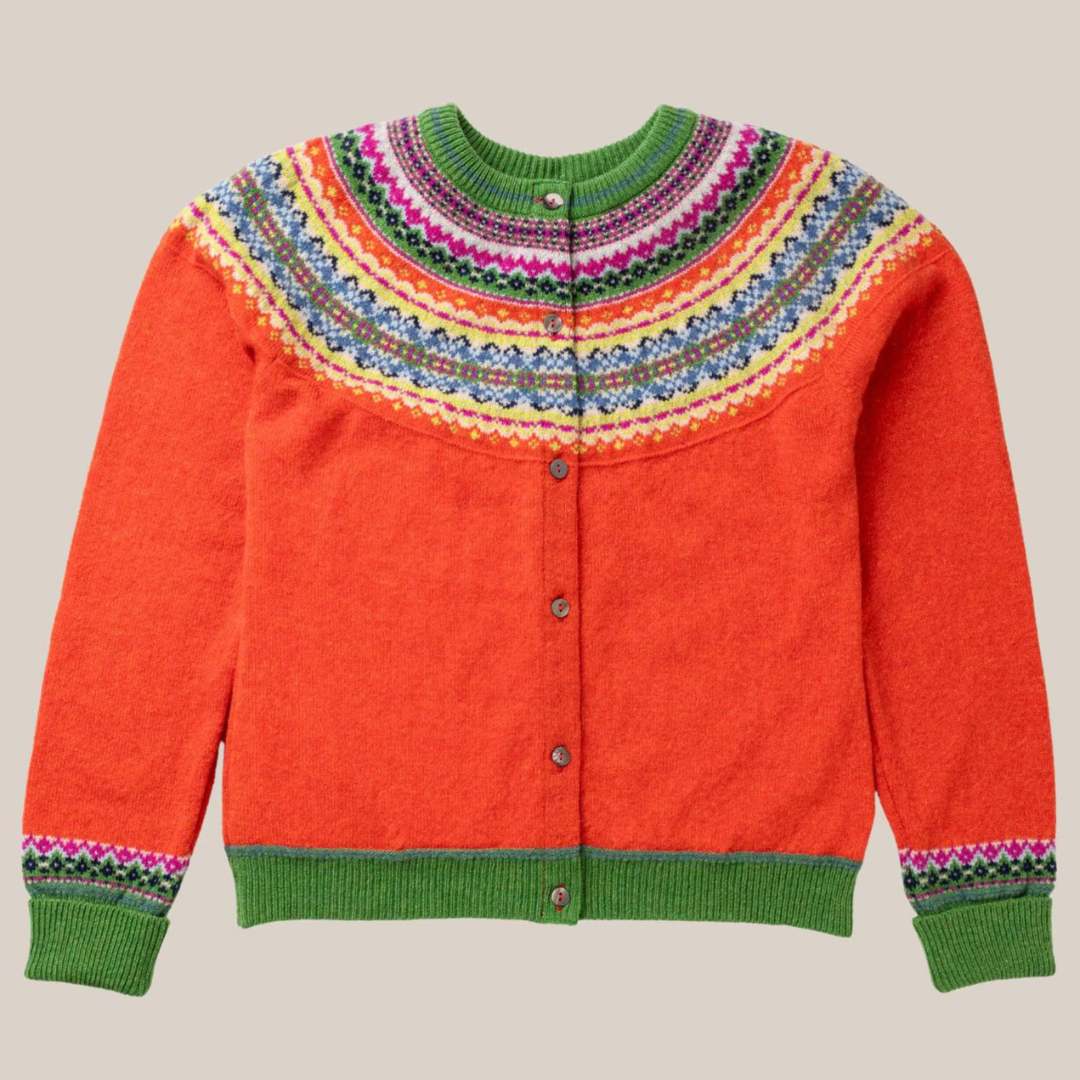 The signature Fair Isle yoke features a striking blend of vibrant pinks, fresh greens, and warm sunset oranges, making this piece a true statement knit. The intricate pattern extends to the long cuffs and hem, perfectly balancing tradition with modern design. Finished with elegant mother-of-pearl buttons, this slim-fit cardigan is versatile enough to layer over dresses or pair with jeans for an effortlessly chic look.