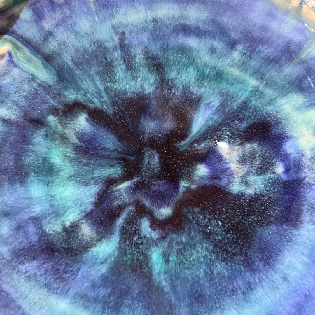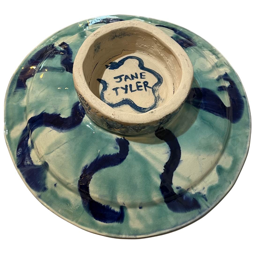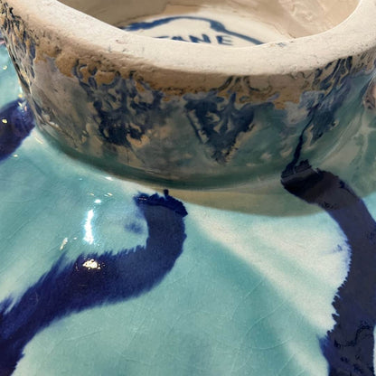 Elevate your home decor with this extraordinary handmade ceramic bowl by Jane Tyler. Measuring 37x9cm, this statement piece features a captivating green and blue glaze with a snake-inspired motif that blends elegance and intrigue. The intricate hand-painted patterns create a sense of depth, making it a standout addition to any collection. Jane Tyler’s signature on the base guarantees authenticity, adding an exclusive touch to this one-of-a-kind creation. Perfect for display, serving, or as a unique gift for art and nature enthusiasts.