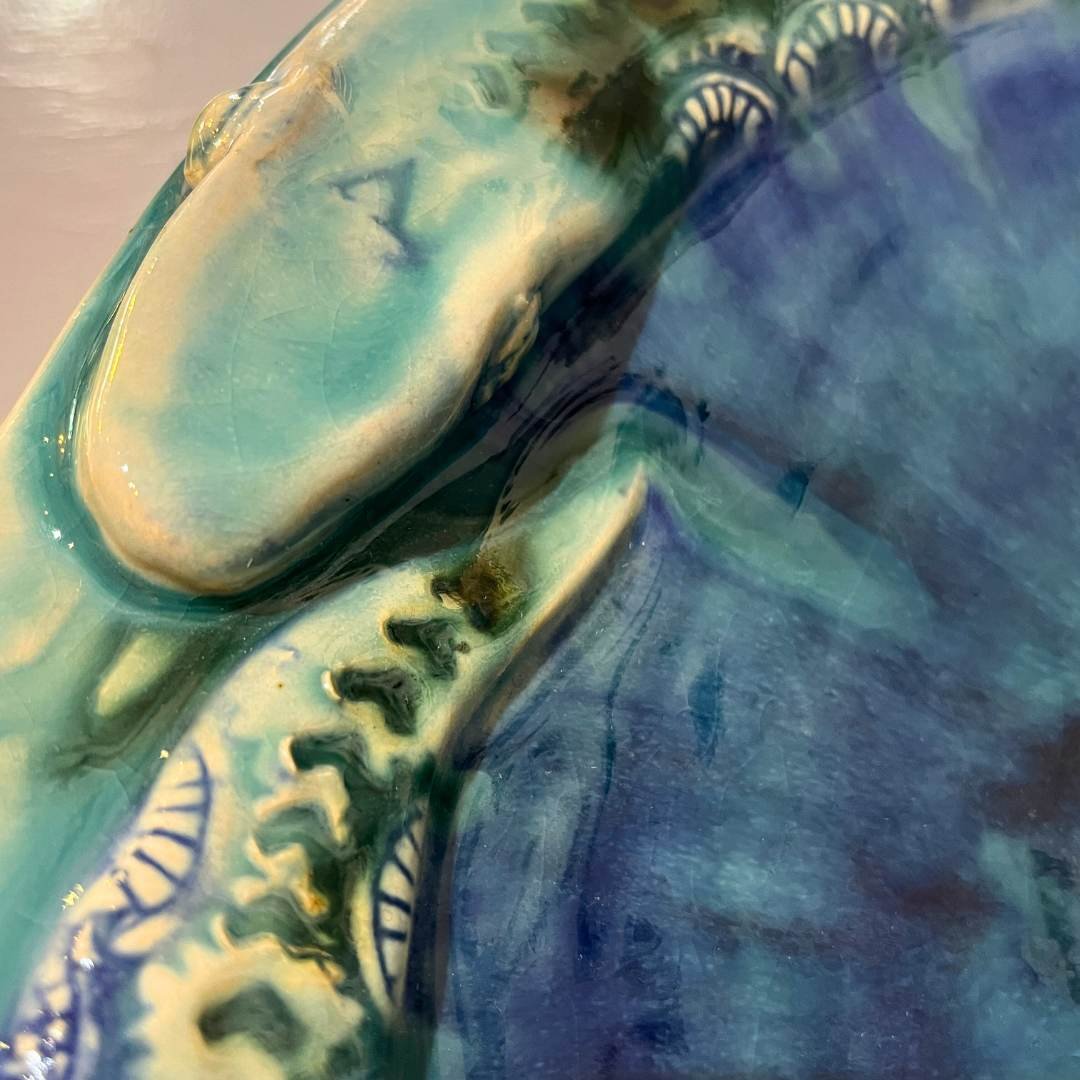 Handmade Large Green and Blue Snake Motif Ceramic Bowl