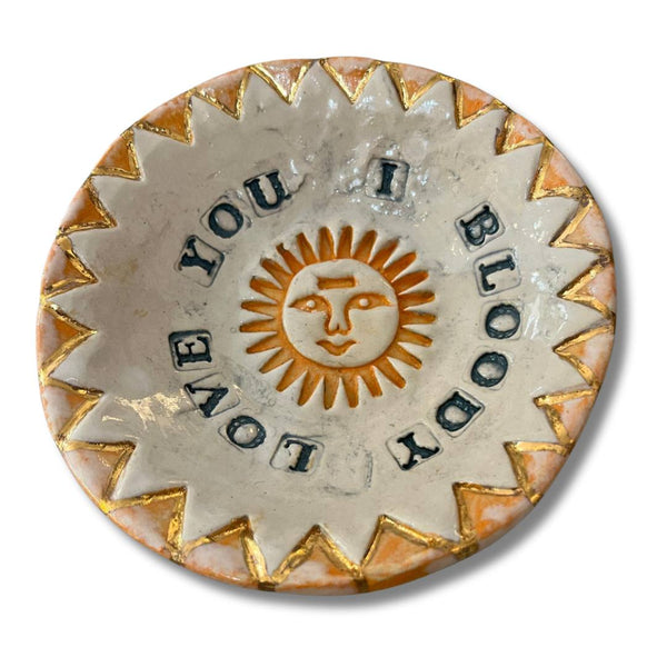 A bold little declaration from the heart. This 13.5cm ceramic trinket dish by Jane Tyler says “I bloody love you” in a classic typewriter font, circling her signature sunshine face. With golden zigzag rays around the rim and a gently vintage glaze, it’s a quirky and heartfelt piece that makes a big statement.