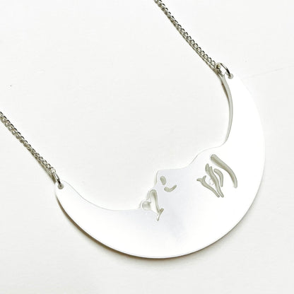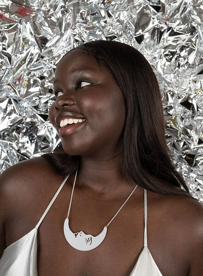 Add a touch of celestial charm to your ensemble with our La Luna Moon Necklace in Moonlight. This classic crescent moon, now available in a fresh colourway, is laser cut from lustrous acrylic that shines with a silver sheen. Featuring intricate cut-out face details, it evokes the timeless allure of the woman on the moon. Suspended from an adjustable silver-tone chain, this space-inspired necklace pairs beautifully with star prints to create a look that rivals the night sky.