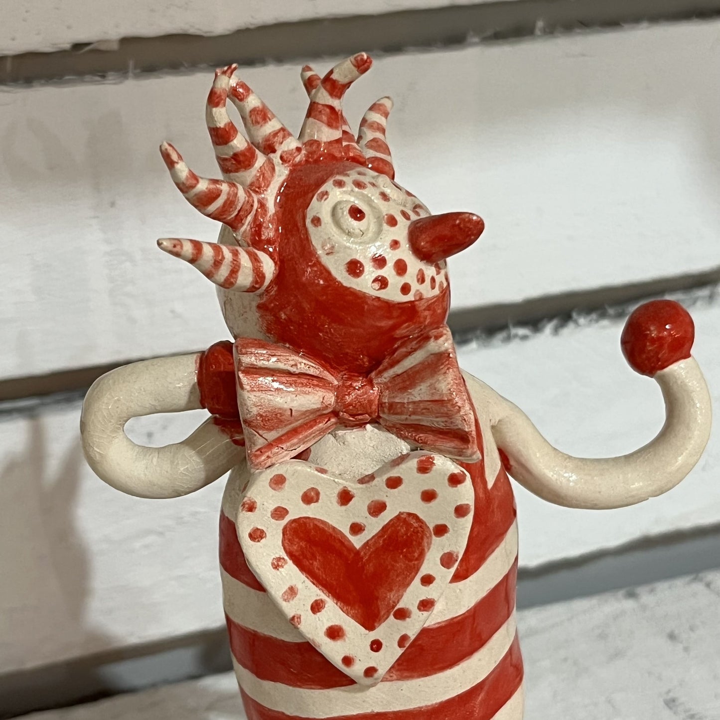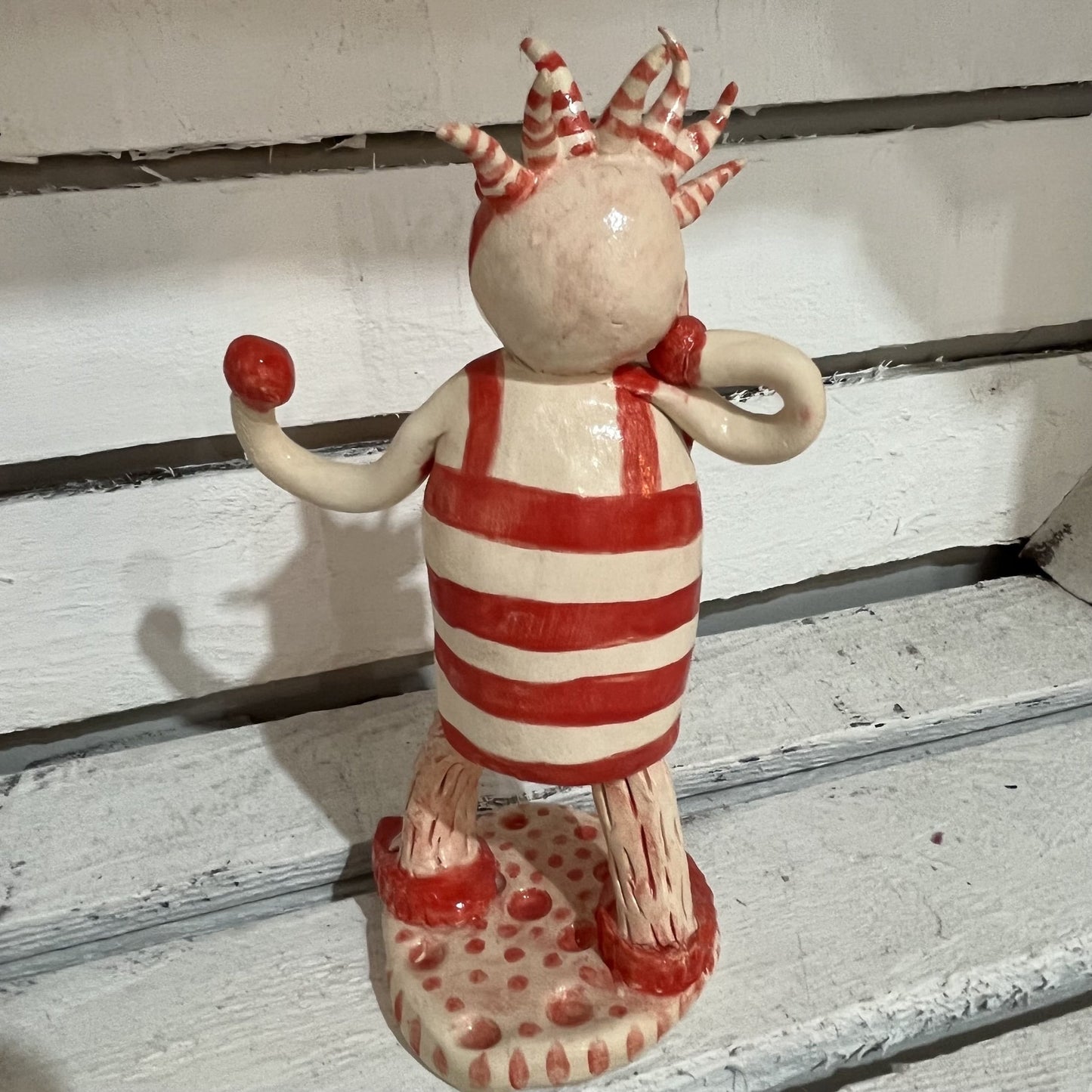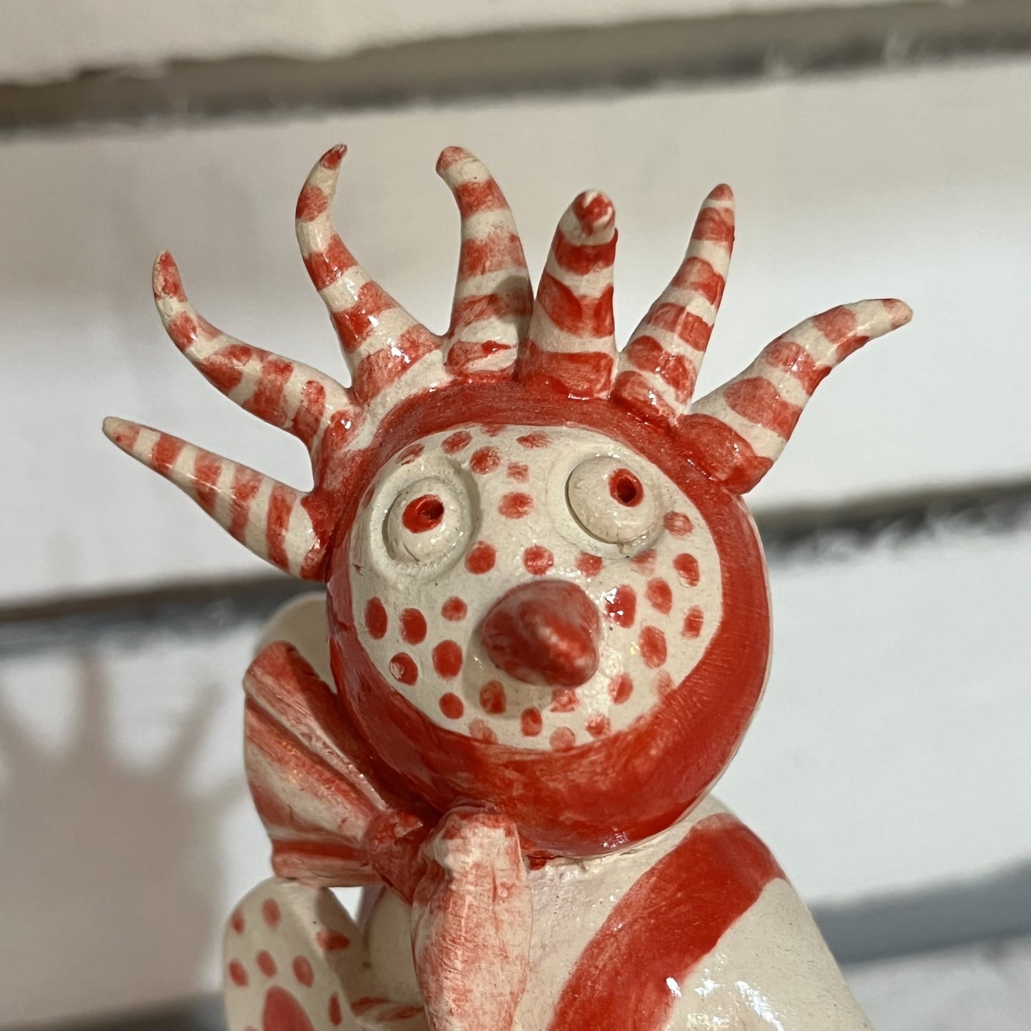 Bring a touch of whimsy to your decor with this delightful Red and White Jester Figurine, handcrafted by local artist Judith Douglas. This charming figure stands proudly in a playful pose, exuding character and charm. The jester's stance, with one arm bent and holding a red ball, suggests a moment of joyful performance. His head, adorned with spiky tendrils, adds a unique and fantastical element to his appearance.