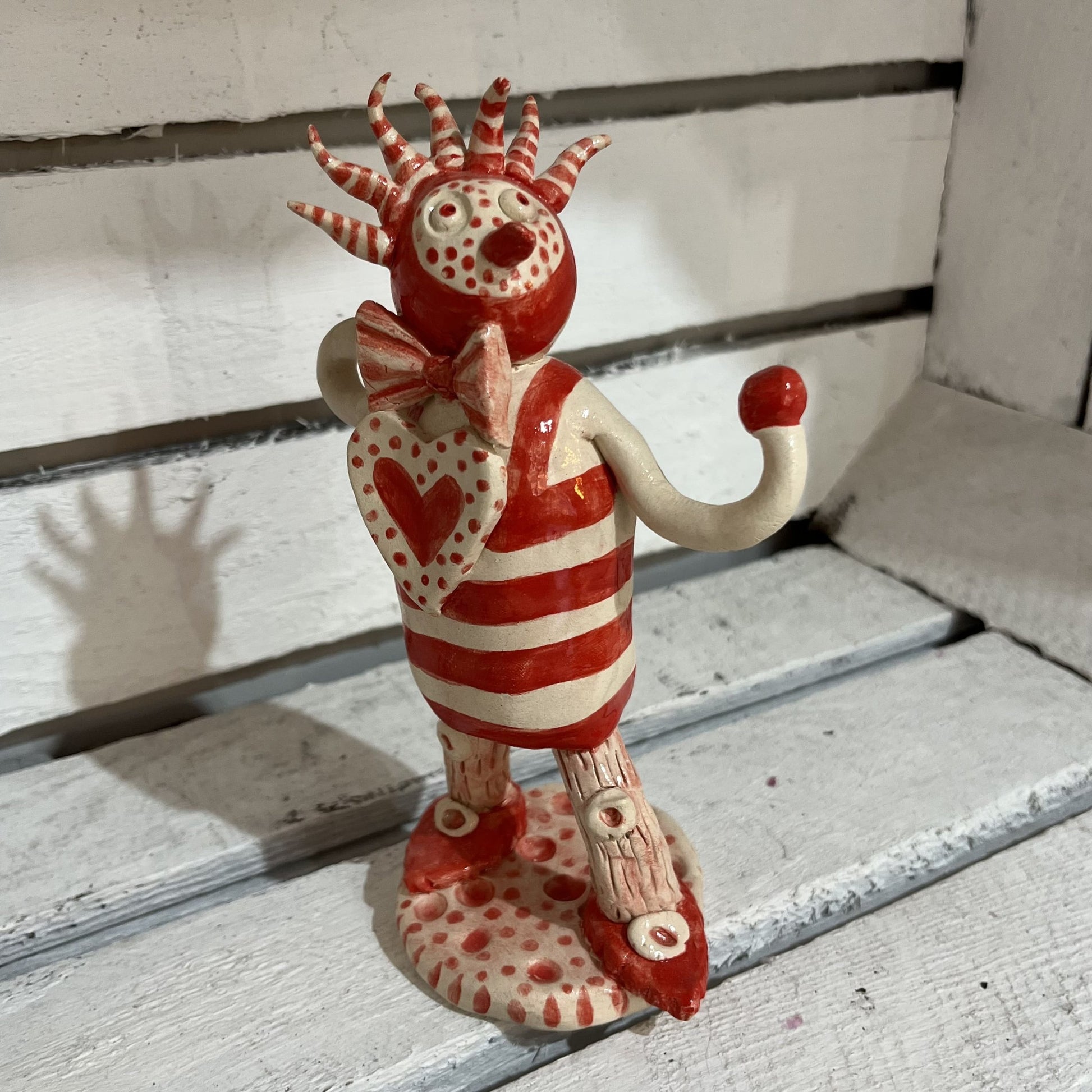 The jester is dressed in a striking red and white striped outfit, complete with a heart motif on his chest. His polka-dotted shoes and stand, coupled with the detailed hand-painted patterns, showcase the meticulous craftsmanship involved in creating this piece. The expressive face and intricate design make this figurine a true conversation starter.