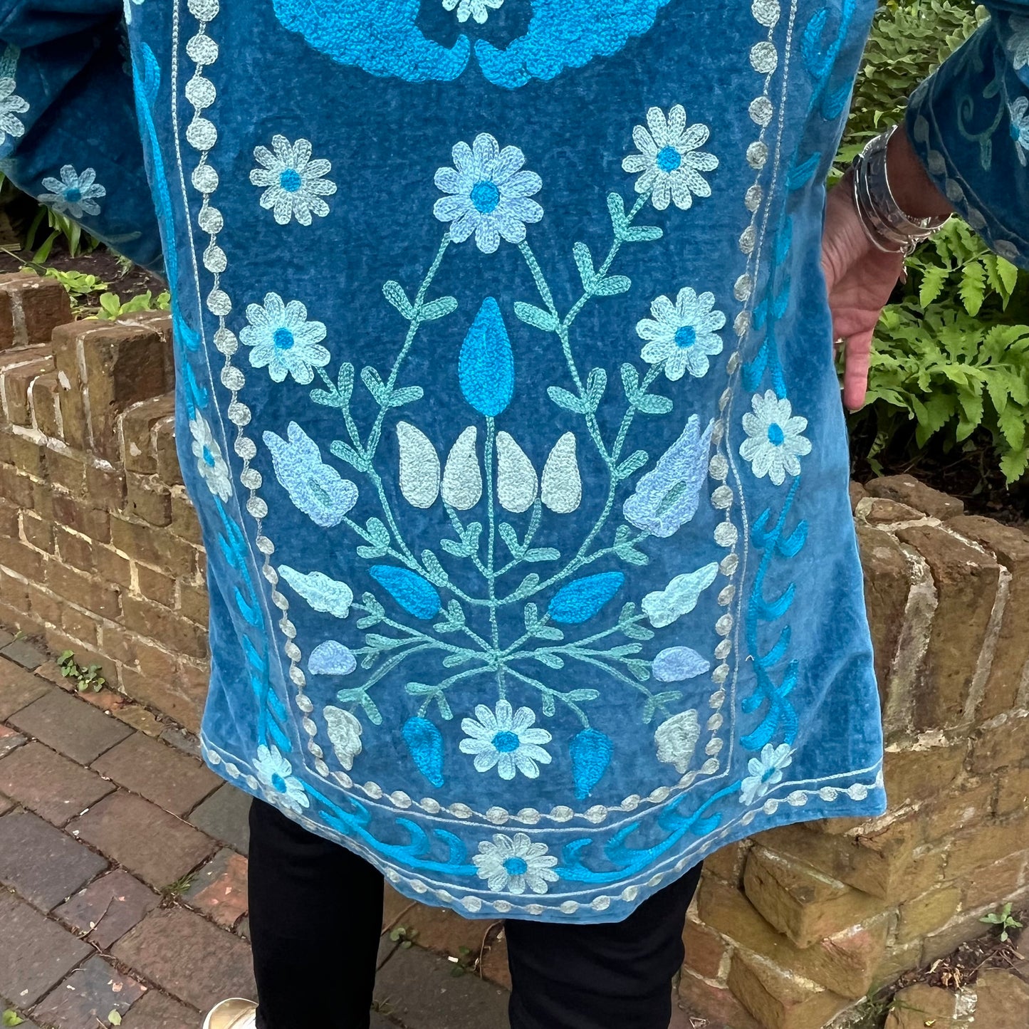 Elevate your style with the Rajasthani Sky Blossom Jacket—a handcrafted floral masterpiece that captures the essence of serene beauty and artisanal craftsmanship.