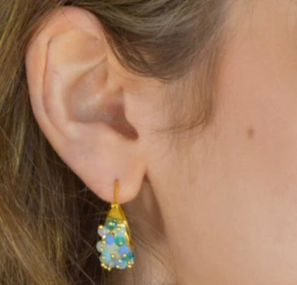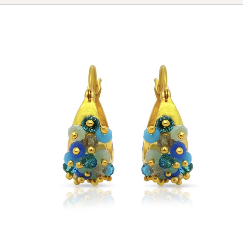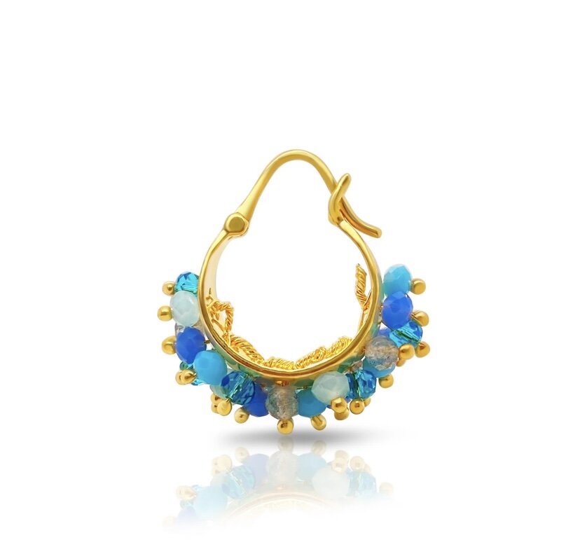 Hoops with a difference! Our Blue Bejewelled Hoop Earrings are fun, bold, and fabulous. These stunning wide gold hoops are adorned with 28 small gemstone beads, each tipped with gold balls, and threaded through a generous gold arc. The gemstones include blue and aqua chalcedony, labradorite, and hydra blue topaz, creating a vibrant and colourful design.