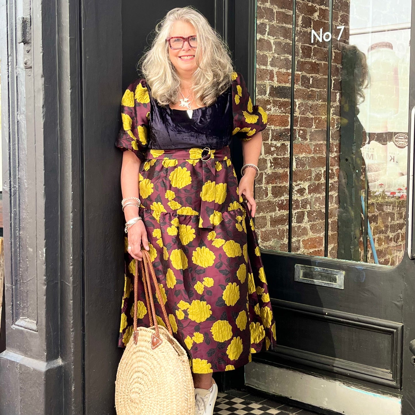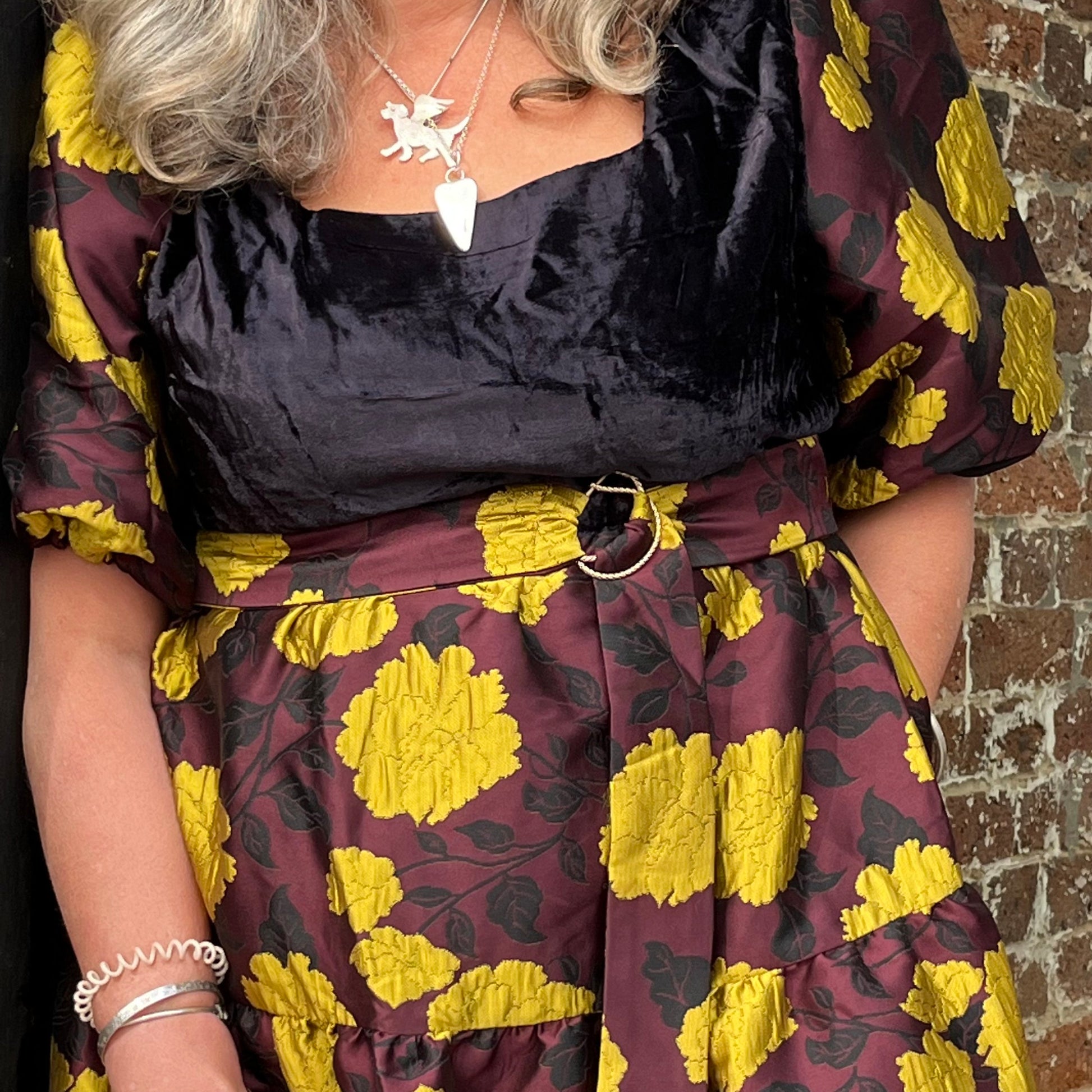 Embrace vintage glamour with the Velvet and Floral Jacquard Dress by Emily Lovelock, a luxurious piece that combines rich textures and bold design. This stunning dress features a deep velvet bodice paired with a vibrant floral jacquard skirt, bringing the sophistication of 70s couture to modern fashion. Puff sleeves and a cinched waist with a statement belt add to its timeless elegance, making it the perfect choice for standout occasions.